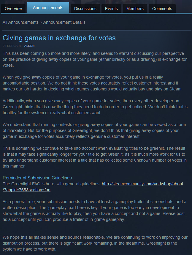 En un reciente anuncio, Valve está pidiendo a los desarrolladores que abandonen esta práctica. Los responsables de Steam dicen que les coloca "en una posición incómoda", y que los votos conseguidos así "no reflejan con exactitud el interés de los consumidores", lo cual es supuestamente el objetivo de Greenlight.
